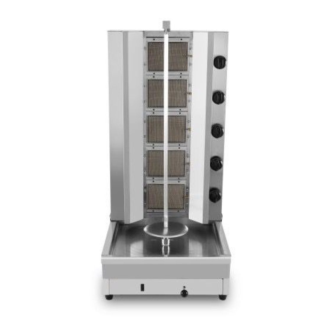 Máquina de Kebab com 5 Queimadores a Gás e Bandeja Extraível - Número de queimadores : 5 - Potência total dos queimadores : 19,3 Kw - Tamanho do espeto: 710 mm (H) - Velocidade de rotação: 2,5 rpm - Dimensões: 525x630x1050 (LxPxA) mmEquipamento disponível para aluguer. Para um orçamento mais detalhado entre em contacto connosco via WhatsApp.
