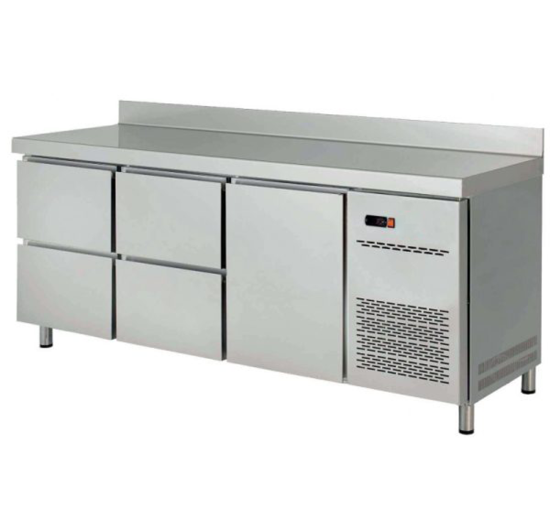 Bancada Refrigerada de 4 gavetas e 1 porta Medidas: 2017x600x850mm Temperatura: -2 / +8 °C Capacidade: 390 litros Classe energética: C Consumo: 1118kWh/ano Potência: 220W