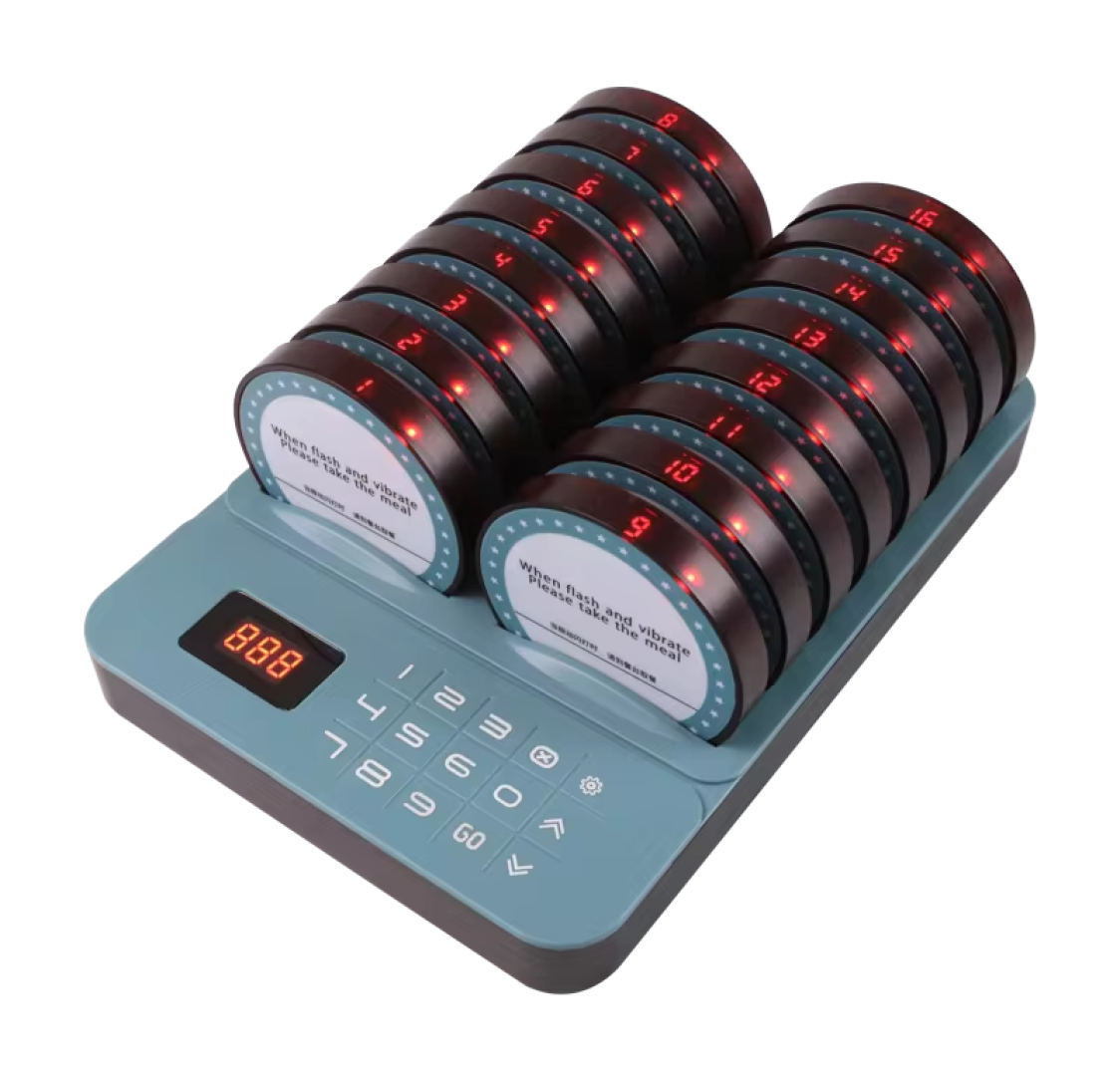 Sistema de chamada para restaurante / Beeper / Pager Preto, 16 discos e 1 relógio, alcance 300m - A tensão é 110V-240V - Tamanho do pager: 80x11mmEquipamento disponível para aluguer. Para um orçamento mais detalhado entre em contacto connosco via WhatsApp.