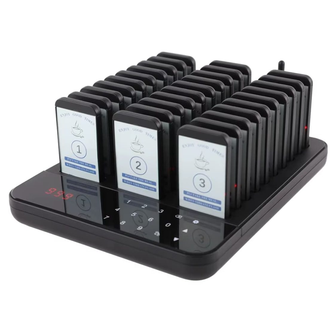 Sistema de chamada para restaurante / Beeper / Pager, 30 discos e 1 base transmissora, alcance 400m - Área de personalização em cada pager - O pager pode tocar, vibrar e piscar.Equipamento disponível para aluguer. Para um orçamento mais detalhado entre em contacto connosco via WhatsApp.