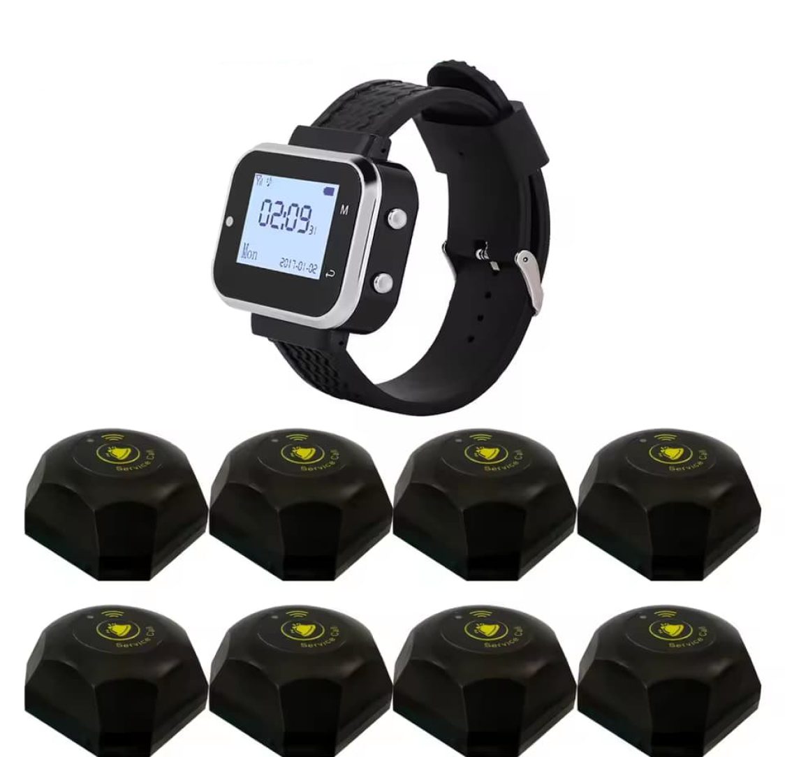 Sistema de chamada para restaurante / Beeper / Pager Preto, 8 discos e 1 relógio, alcance 800m - Sistema sem fios - Dimensão: 60x60x32mm - Poder: bateria 12V23A - Alcance: 800 metros (área aberta)Equipamento disponível para aluguer. Para um orçamento mais detalhado entre em contacto connosco via WhatsApp.