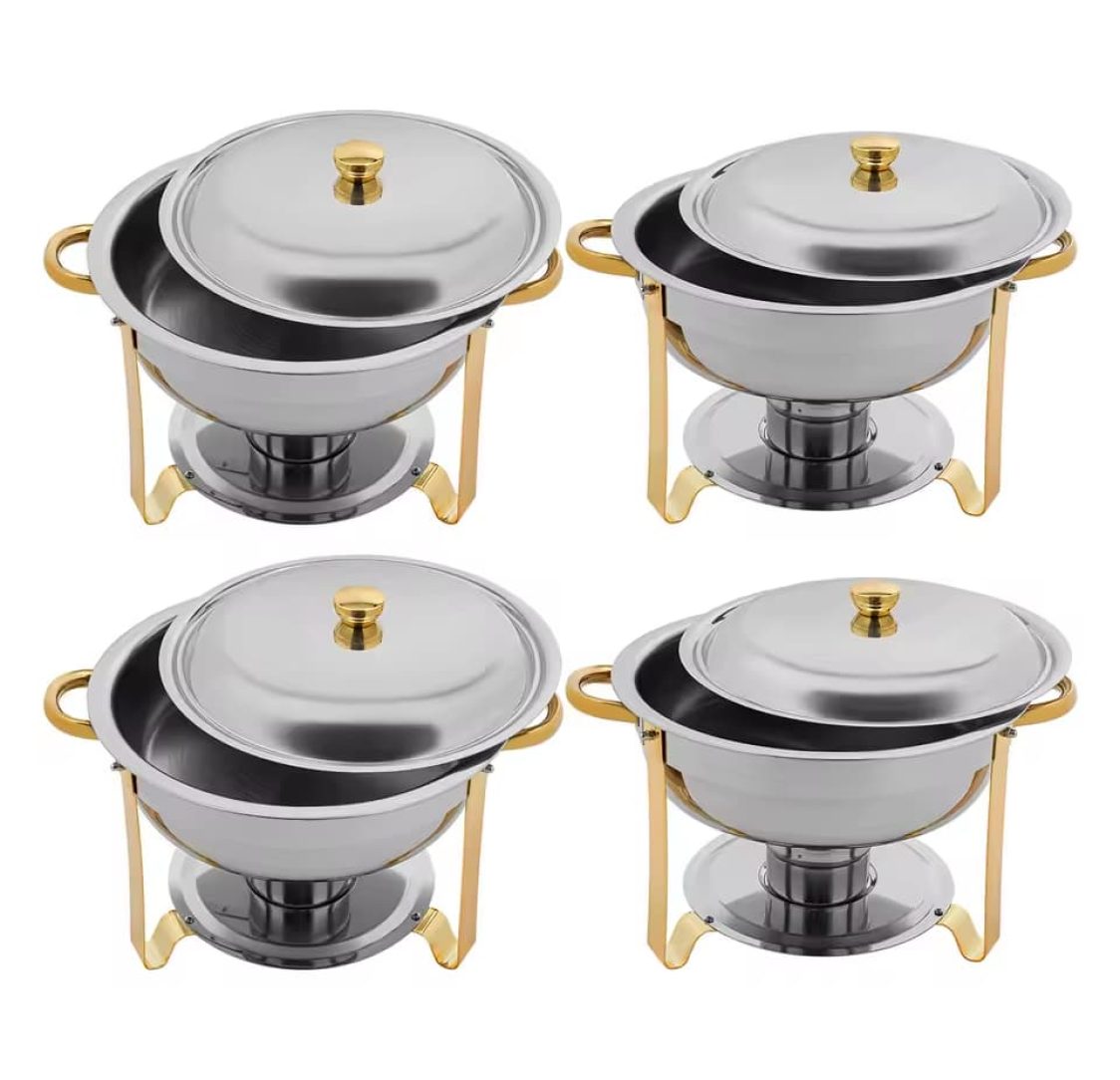 Conjunto 4 Rechauds / Aquecedores de alimentos para buffet redondos 4.5L em aço inoxidável dourados - Tamanho do produto: Ø 41x25 cmEquipamento disponível para aluguer. Para um orçamento mais detalhado entre em contacto connosco via WhatsApp.