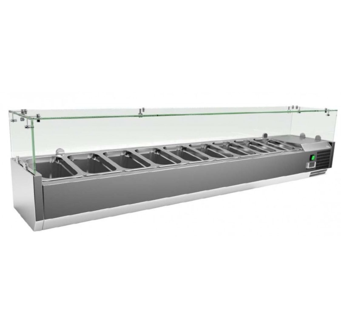 Vitrine Horizontal 9 cubas Medidas: 2090x440x295mm Temperatura: +2 / +8°C Capacidade: 9 unid. GN1/3 Potência: 180 W Tensão: 230 VEquipamento disponível para aluguer. Para um orçamento mais detalhado entre em contacto connosco via WhatsApp.