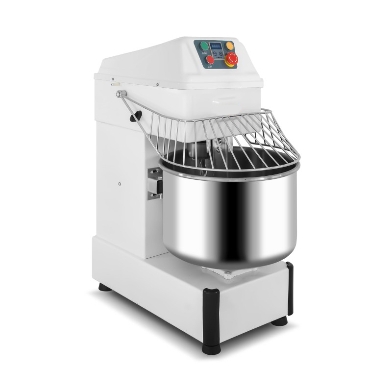 Caraterísticas técnicas – Especialmente recomendada para padarias, hotéis e restaurantes, onde são essenciais aparelhos de cozinha fiáveis e de alto desempenho. – Mistura todos os ingredientes necessários para a preparação de grandes massas com movimentos precisos e potentes. – Particularmente adequada para massas de elevada consistência, como pizza ou pão. – Equipada com grelha de proteção em aço inoxidável e todos os elementos de segurança eléctrica. – Chassis em chapa de 5 a 8 mm de espessura. – Exterior com acabamento em tinta epóxi branca. – Caldeirão, gancho em espiral, divisor de massa, grelha de proteção e outros elementos que entram em contacto com a massa são inteiramente em aço inoxidável. – Comandos de 24V e botão de paragem de emergência. – Equipamento equipado com 2 velocidades. – Temporizador de série. – Tina e cabeça fixas.