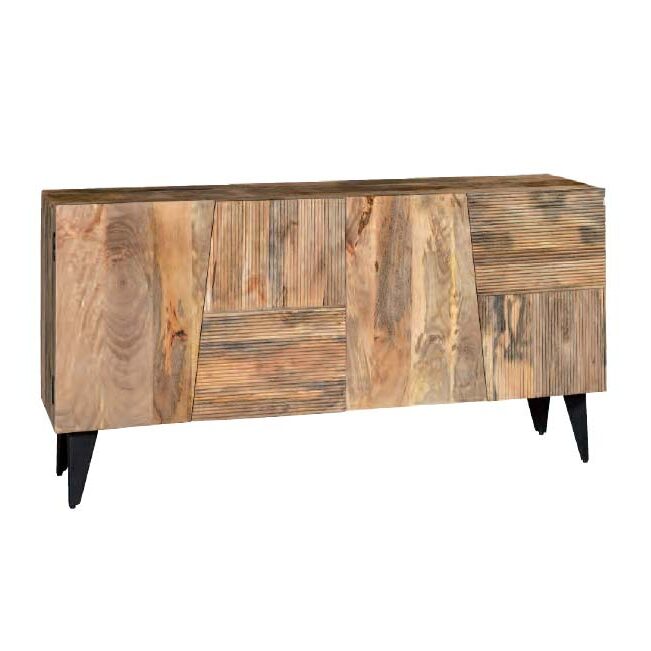 Aparador Aton Ethnic, feito à mão em madeira maciça de acácia. Estilo étnico-moderno realçado pelo acabamento refinado das portas, dando-lhe um carácter contemporâneo. Composto por duas portas com prateleira interior e quatro gavetas. Pés em ferro. Perfeito para ambientes modernos e industriais. O metal juntamente com as nuances quentes da madeira criam um efeito bonito, muito elegante e requintado – Dimensões: 160x40x82cm