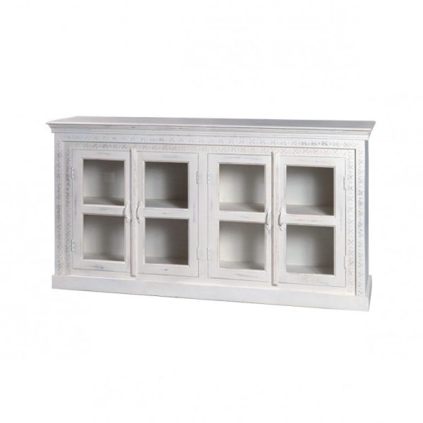 Aparador Chagall, feito à mão em madeira maciça, esculpido e decorado à mão. A decapagem ligeiramente antiquada torna o seu espaçomais leve e luminoso. Composto por 4 portas com vidro, equipadas com uma prateleira interior para melhor organizar a sua loiça.