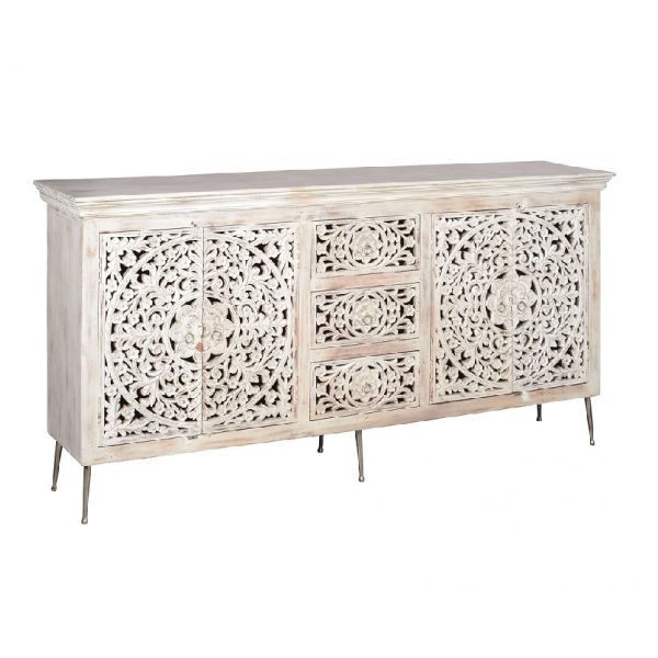 O aparador Jasmine é feito em madeira maciça embutida. Tem uma linha vintage, moderna e essencial. Pode ser utilizado de várias formas, quer como aparador, quer como aparador alto. A sua estrutura e medidas são perfeitas para mobilar o seu espaço. Aparador com incrustações esculpidas à mão nas portas. Único e original no seu género. Composto por 4 portas esculpidas à mão com prateleira interior e 3 gavetas centrais. – Dimensões: 195x41x100cm