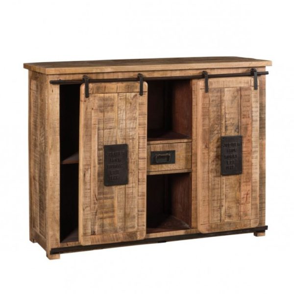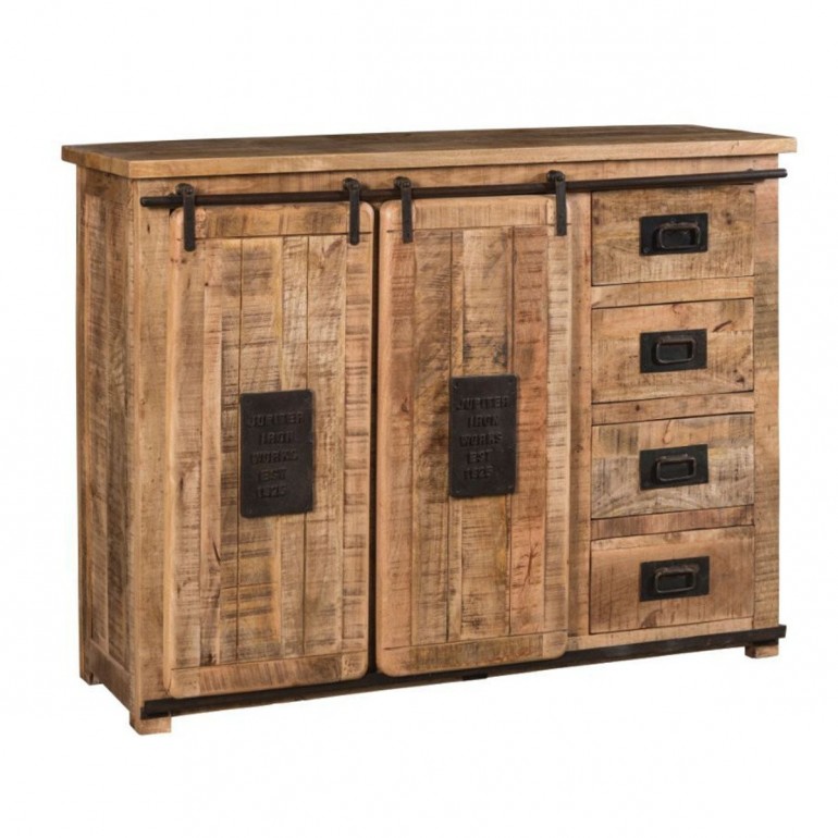 Aparador em madeira maciça com portas de correr, prateleiras e gavetas, uma peça de mobiliário robusta e muito espaçosa em estilo industrial vintage. A particularidade que torna este móvel único está nos acabamentos e nas nuances de cor, cada peça é única é normal que o aspeto das cores possa ser ligeiramente diferente para cada peça placas de ferro particulares que combinam com as peças de ferro. Composto por 2 portas de correr com prateleira interior e 5 gavetas com puxador em ferro. – Dimensões: 140x40x106cm