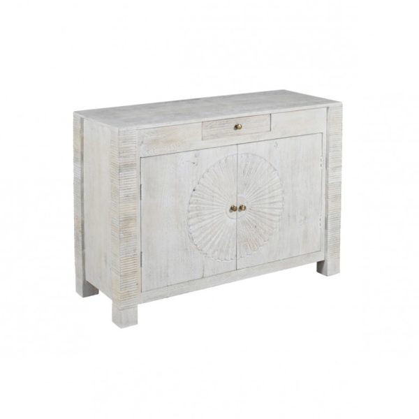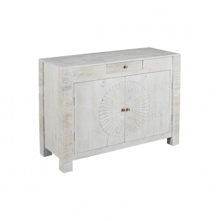 Aparador Sun Branco, móvel de linhas essenciais, enriquecido por um entalhe que lhe confere originalidade e harmonia. A cor clara torna estes móveis adequados a qualquer ambiente. Aparador artesanal em madeira maciça de acácia, cor branco decapado. Composto por 2 portas com puxador e 1 gaveta na parte superior do aparador. – Dimensões: 120x50x90cm
