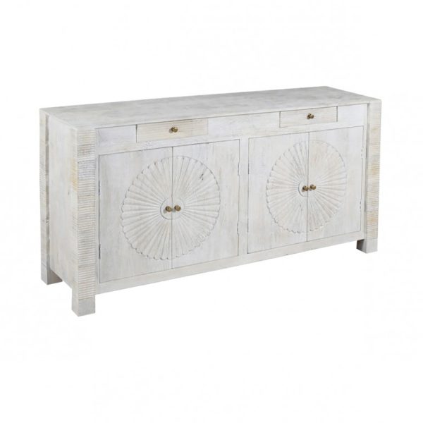 Aparador Sun Branco, móvel de linhas essenciais, enriquecido por um entalhe que lhe confere originalidade e harmonia. A cor clara torna estes móveis adequados a qualquer ambiente. Aparador artesanal em madeira maciça de acácia, cor branco decapado. Composto por 2 portas com puxador e 2 gavetas na parte superior do aparador. – Dimensões: 175x50x90cm