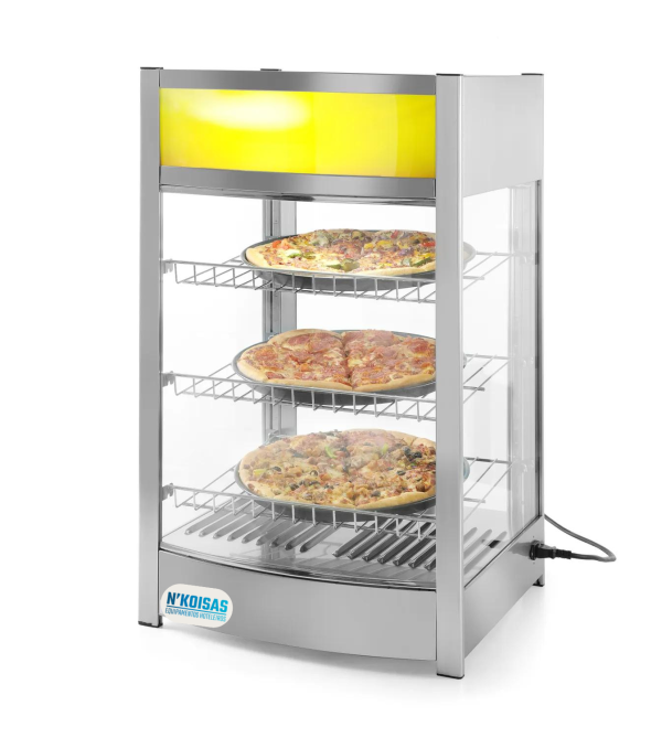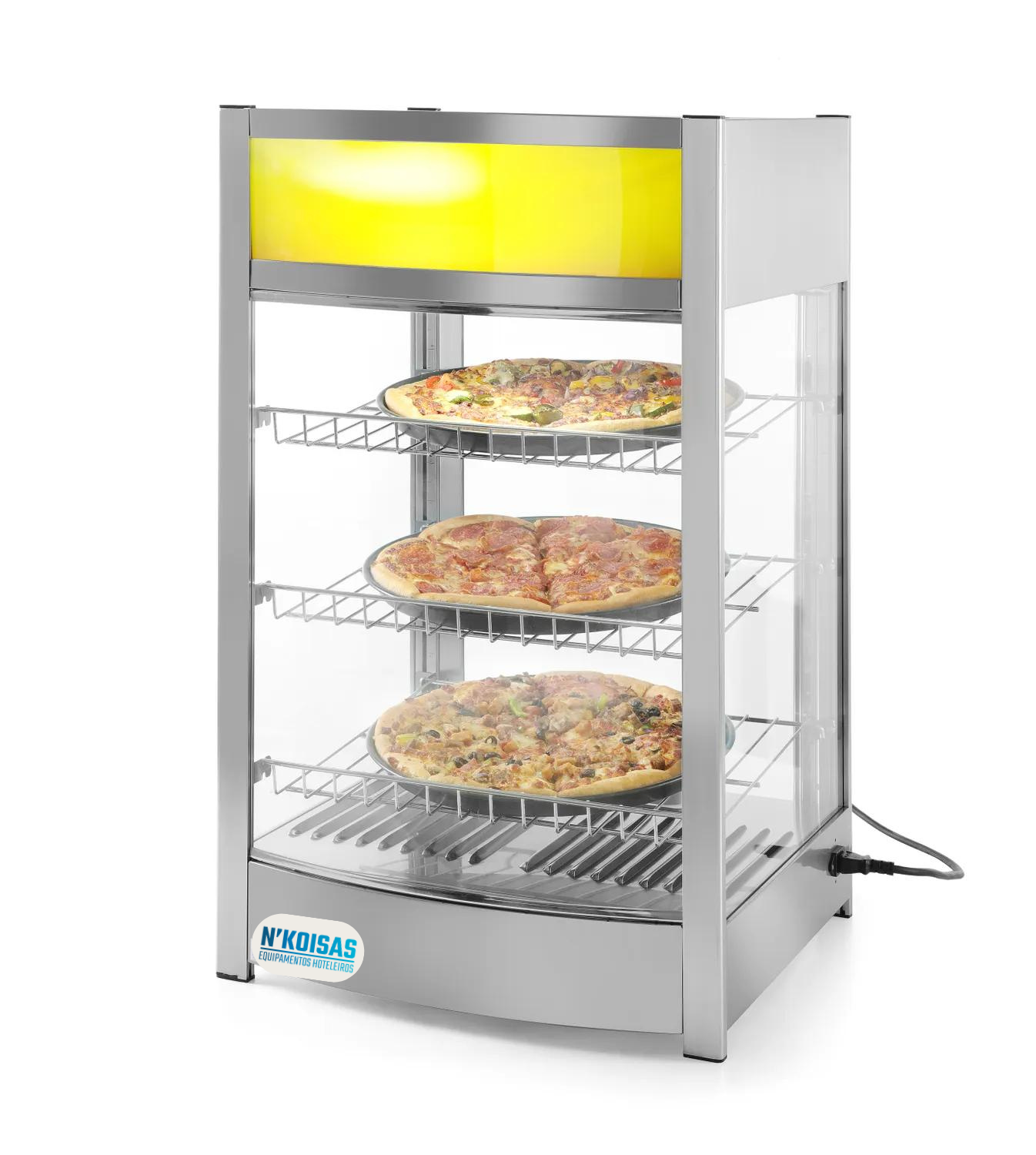 Equipada com porta traseira e vidro frontal curvo. Lightbox com espaço para gráficos promocionais. Carcaça de aço inoxidável. Iluminação interna no teto. Com 3 prateleiras cromadas, reguláveis em altura 400×335 mm. Reservatório de água para umidificação do ar na cabine de aquecimento. Controlador de temperatura e display. Faixa de temperatura: 30°C até 90°C.