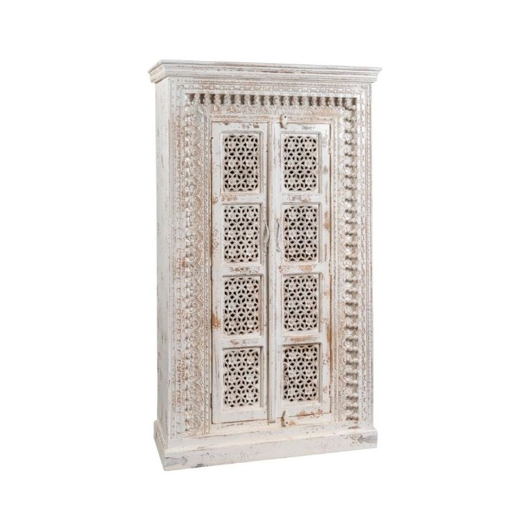 Armário Namastè, esculpido a partir de partes de portas ou frisos de um palácio indiano, 2 portas esculpidas com 4 prateleiras interiores. Olhando para este armário em particular, só podemos imaginar a perícia dos artesãos que o fabricaram. O estilo étnico entra no espaço e dá-lhe um ar evocativo. – Dimensões: 106x43x181cm