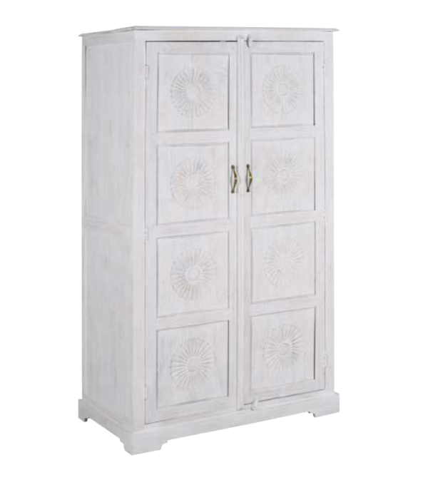 Roupeiro inteiramente em madeira maciça de acácia, que dará um toque de originalidade ao seu quarto. Decore o seu espaço com um estilo étnico. Roupeiro composto por duas portas com puxador, no interior existem 4 prateleiras com uma estante em madeira maciça. As portas são esculpidas à mão, a cor do roupeiro é branco decapado. – Dimensões: 120x60x200cm