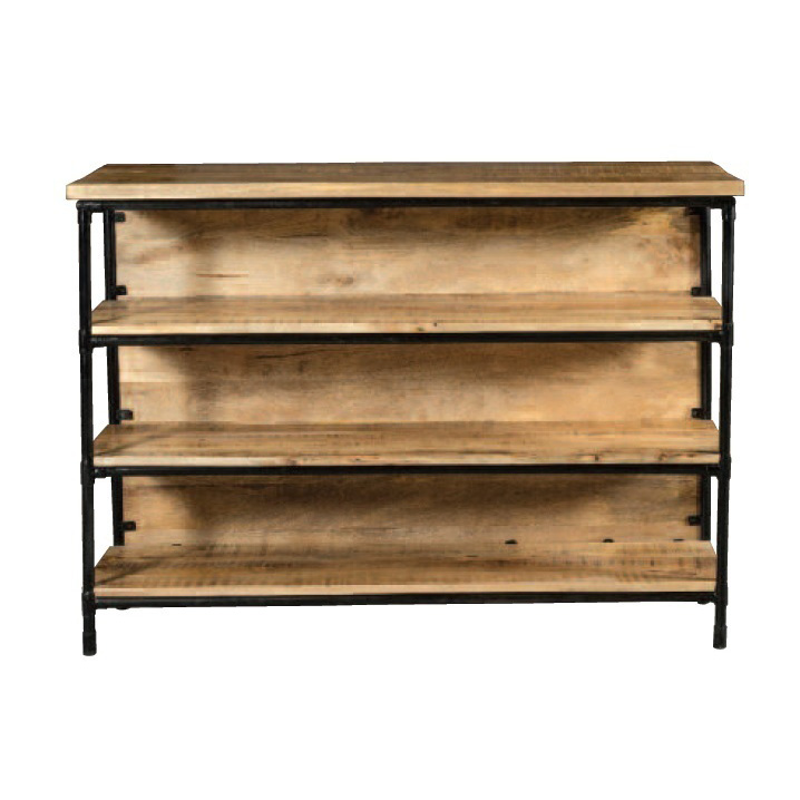 Balcão de bar Boulton, fabricado em madeira maciça e ferro. Composto por prateleiras na parte de trás, e apoios para os pés na parte da frente. Balcão de bar espaçoso, adequado e apropriado para caraterizar o seu espaço com amigos, colocado ao lado de uma cozinha, numa sala de estar ou num hall de entrada, ou para mobilar o seu bar ou pub com estilo. – Dimensões: 144x55x107cm