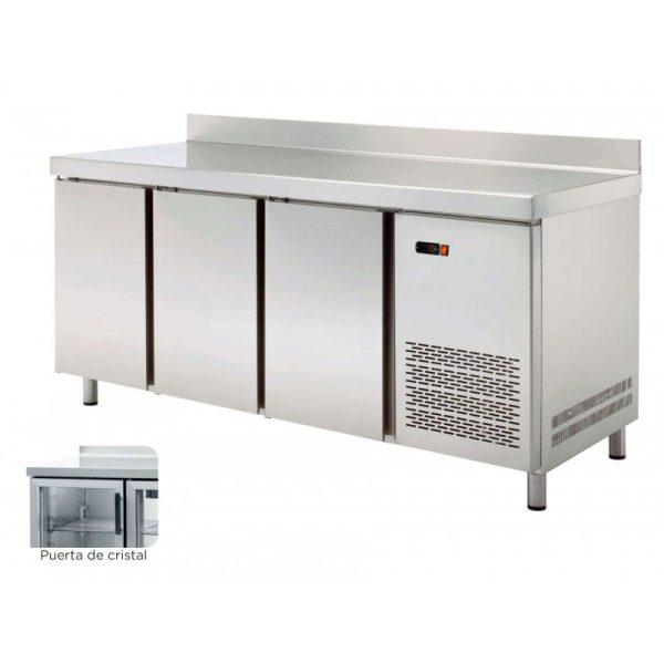 Características Técnicas – Fabricante espanhol com mais de 30 anos de experiência e uma referência no mercado internacional. – Fabricado em aço inoxidável AISI-304 no interior e exterior do móvel. – Compressores DANFOSS SECOP. 3 – Isolamento em poliuretano injetado de 40 Kg/m de densidade. – Cantos arredondados no interior e bancada com lambrim sanitário de 100 mm. – Evaporador de tiragem forçada com revestimento anti-corrosão. – Controlo eletrónico e digital de temperatura e descongelação. – Evaporação automática da água de descongelação. – Pés em aço inoxidável reguláveis em altura. – Prateleiras em aço plastificado com suportes reguláveis em altura. – Excelente relação qualidade/preço. – As mesas com portas de vidro estão equipadas com fechadura e iluminação LED. – Fiabilidade garantida pela utilização de componentes de alta qualidade, compressores economizadores de energia e parâmetros de controlo eletrónico optimizados. – A unidade de refrigeração está protegida por uma grelha basculante para facilitar o acesso e a manutenção. Foi concebida com um grande sistema de ventilação frontal e uma entrada de ar adicional por cima da grelha para facilitar a circulação do ar. Em caso de espaços reduzidos, este sistema melhora significativamente o funcionamento da unidade. – Portas com dispositivo de fecho automático e dispositivo de fecho de abertura para poupança de energia e comodidade no trabalho diário. As portas têm um puxador integrado que é fácil de limpar. – Equipada de série com todos os elementos que facilitam a limpeza: calafetagem substituível, guias amovíveis, fundo sanitário embutido, juntas curvas, dreno que permite a evacuação de líquidos residuais. – Gás refrigerante ecológico R-290.