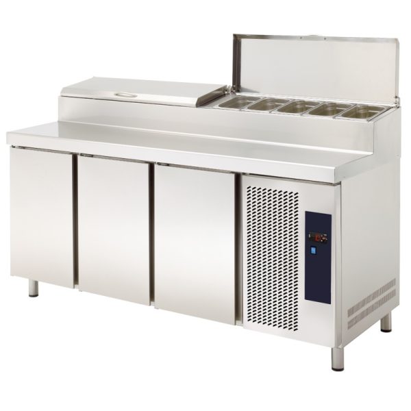 Dados técnicos – Portas: 3 – Temperatura: -2 / +8 (°C) – Capacidade: 445 litros – Capacidade da vitrina de ingredientes: 9 tabuleiros GN1/3 de 150 mm de profundidade. – Superfície útil de trabalho: 315 mm – Potência: 590 W – Dimensões: 1800x708x850 (LxPxA) mm