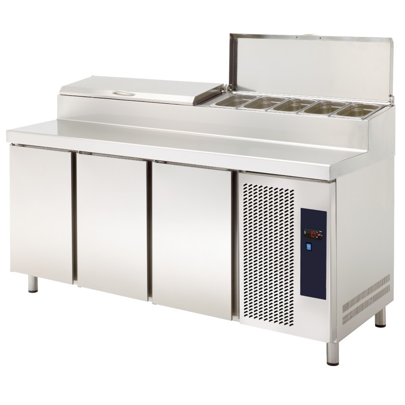 Características técnicas – Bancada refrigerada para preparação de pizzas e saladas com expositor de ingredientes incorporado. Possui uma tampa articulada em aço inoxidável com 2 posições de abertura, uma de 60º e outra de 90º. A refrigeração dos tabuleiros é efectuada por meio de comunicação com o armário inferior. – Fabricante espanhol com mais de 30 anos de experiência e uma referência no mercado internacional. – Fabricado em aço inoxidável AISI-304 no interior e exterior do armário. – Compressores DANFOSS SECOP. – Isolamento em poliuretano injetado com densidade de 40 Kg/m. – Cantos arredondados no interior. – Evaporador de tiragem forçada com revestimento anti-corrosão. – Controlo eletrónico e digital da temperatura e da descongelação. – Evaporação automática da água de descongelação. – Pés em aço inoxidável reguláveis em altura. – Prateleiras em aço plastificado GN1/1 com suportes reguláveis em altura. – Excelente relação qualidade/preço. – Fiabilidade garantida pela utilização de componentes de alta qualidade, compressores de baixo consumo e parâmetros de controlo eletrónico optimizados e testados nos nossos laboratórios. – A unidade de arrefecimento está protegida por uma grelha basculante para facilitar o acesso e a manutenção. Foi concebida com um grande sistema de ventilação frontal e uma entrada de ar adicional por cima da grelha para facilitar a circulação do ar. Em caso de espaços reduzidos, este sistema melhora significativamente o funcionamento da unidade. – Portas com dispositivo de fecho e fecho de abertura automáticos para poupança de energia e comodidade no trabalho diário. As portas têm um puxador integrado que é fácil de limpar. – Estão equipadas de série com todos os elementos que facilitam a limpeza: calafetagem substituível, guias amovíveis, fundo sanitário embutido, juntas curvas, dreno que permite a evacuação de líquidos residuais. – Gás refrigerante ecológico R-290.