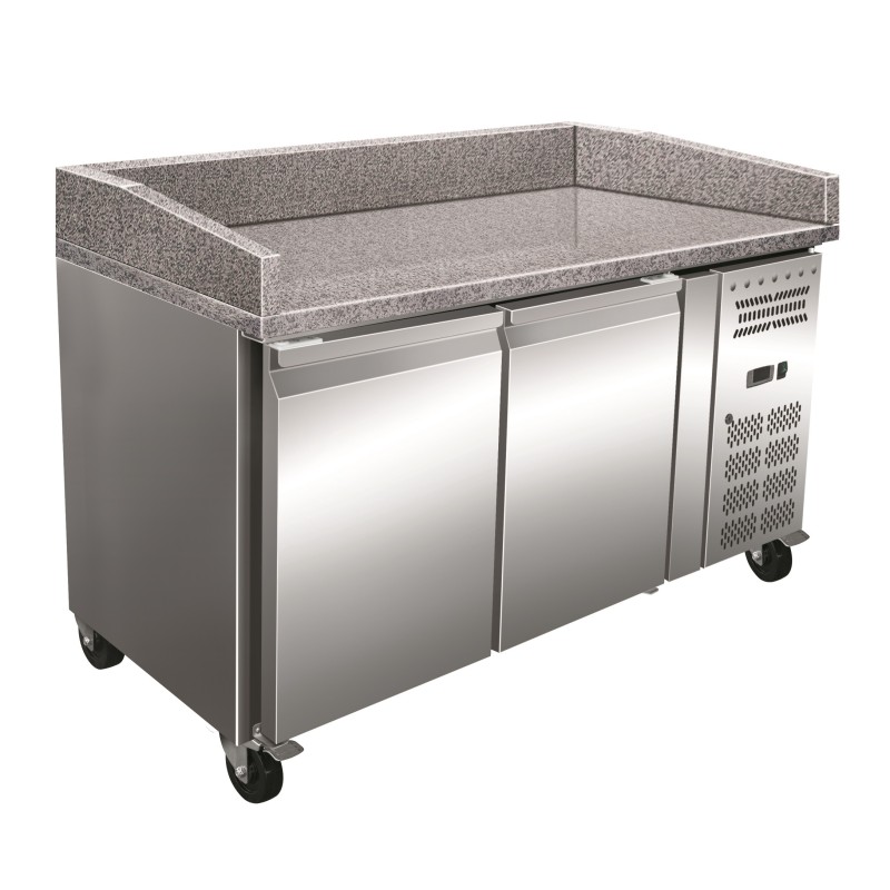 Bancada Refrigerada de 2 portas com tampo em granito para pizzas Medidas embalagem: 1545x840x1050 mm Capacidade bruta: 428 litros Temperatura: +2 /+8ºC Classe climática: 4 Classificação energética: B Consumo: 876 kWh/ano Refrigerante: R290 Potência: 208 W Tensão: 230 V