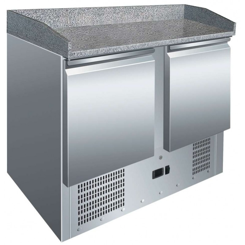 Bancada Refrigerada de 2 portas com tampo em granito para pizzas Medidas embalagem: 1115x765x1195 mm Capacidade bruta: 302 litros Temperatura: +2 /+8ºC Classe climática: 4 Classificação energética: C Consumo: 883 kWh/ano Refrigerante: R290 Potência: 200 W Tensão: 230 V