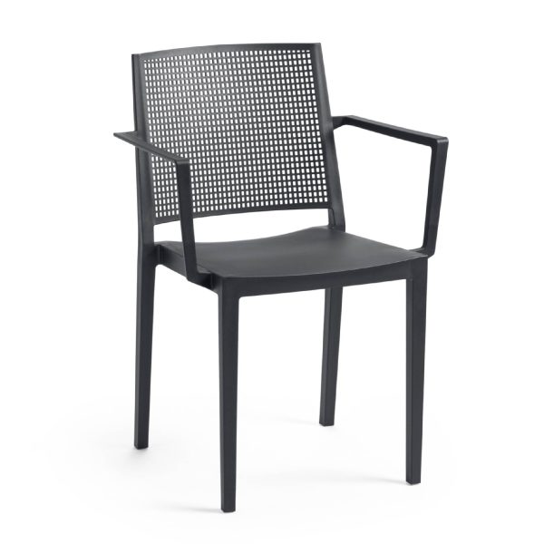 Cadeira Noah com Braços Antracite - Empilhável - Proteção contra UV - Reciclável - Dimensões: 56.5x47.2x88.6cmEquipamento disponível para aluguer. Para um orçamento mais detalhado entre em contacto connosco via WhatsApp.