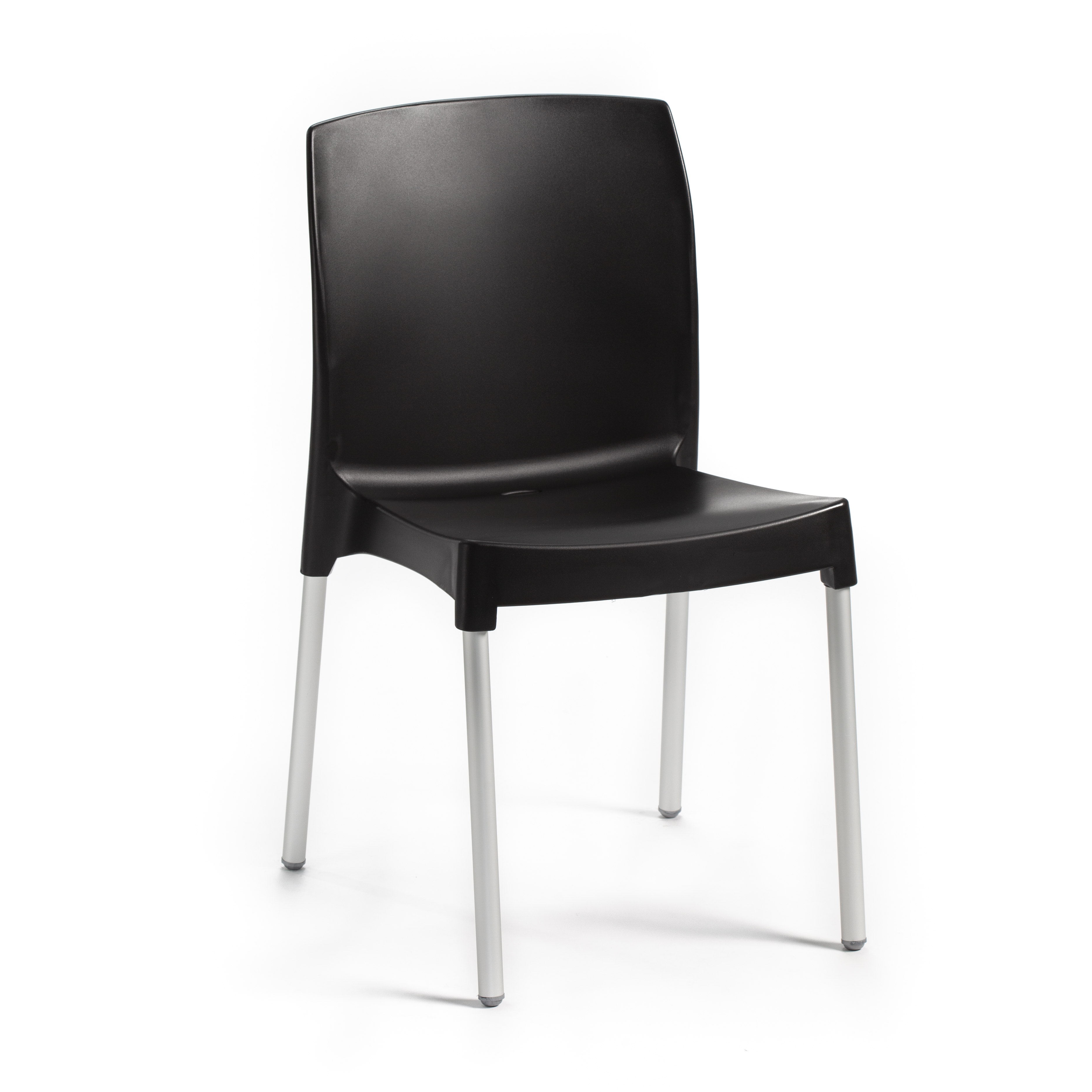 Cadeira fabricada em polipropileno e alumínio anodizado.
