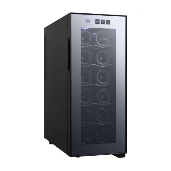 Características técnicas – Cave de vinho com funcionamento termoelétrico. Com sistema de arrefecimento a ar. – Especialmente indicada para a conservação de vinhos tintos. – Exterior e interior em chapa de aço revestida a plástico preto. – Ecrã tátil digital. – Baixo nível de ruído, sem vibrações. – Design elegante com porta de vidro e puxador embutido. – Porta de câmara dupla com vidro espelhado. – Prateleiras metálicas anti-gotejamento. – Tensão: 220-240V. – Amigo do ambiente. Gás refrigerante R600a