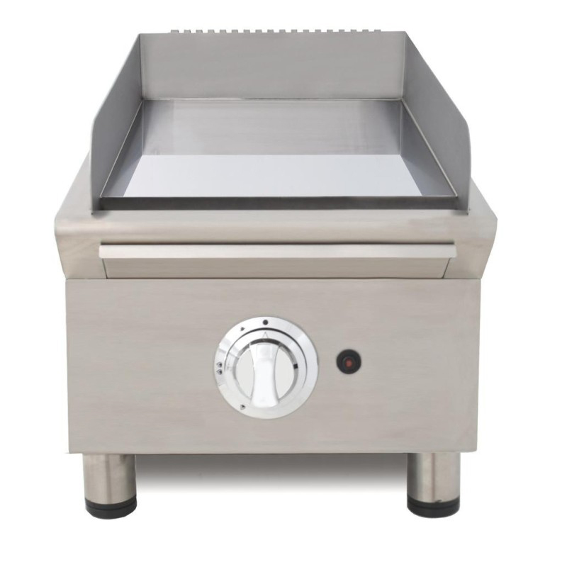 CARACTERÍSTICAS: – Fabricado em Espanha com materiais de alta qualidade. – Certificação CE. – Fabricado em aço inoxidável acetinado, com 1,2 mm de espessura. – Placa para assar com 15 mm de espessura. Chapa de assar com 100 mm de altura e 2 mm de espessura soldada na parte superior, evitando assim a acumulação e filtragem de gordura entre a chapa e as chapas. Fabricado em aço cromado duro de 50 mícrones. – Válvula termostática 300°C que regula o fogo para obter uma temperatura adequada da placa, reduzindo o consumo de gás. – Comandos metálicos em liga de zinco de alta qualidade com quadro de ignição, marcação de máximo e mínimo. – Tabuleiro de gordura frontal de grande capacidade integrado no armário e facilmente amovível. – Ignição piezoeléctrica (1 por válvula de gás). – Pés altos ajustáveis e robustos. – Queimador com saída de chama em todo o perímetro, garantindo uma distribuição uniforme do calor em toda a placa. Sem “zonas frias”. Alto poder calorífico com termopar de segurança. – Saída de gás na parte de trás para facilitar a instalação em locais com pouco espaço. Fornecido de série pré-configurado para gás propano – butano e são fornecidos injectores para mudanças para gás natural.