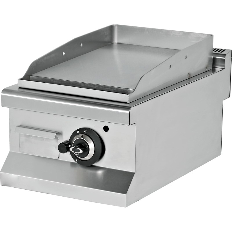 Caraterísticas técnicas – Estrutura construída em aço inoxidável. – Painéis laterais, painéis de controlo e chaminés em aço inoxidável. – Placa de cozedura em aço rectificado com 12 mm de espessura, com para-choques em aço inoxidável soldado na parte superior para garantir a estanquicidade e facilitar a limpeza diária. – Queimador tubular para uma distribuição uniforme do calor, com válvula de segurança, termopar e chama piloto. – Ignição piezoeléctrica. – Canal com orifício para limpeza da placa e evacuação de gorduras em aço inoxidável. – Gaveta de recolha de gorduras amovível em aço inoxidável. – Fornecido pré-ajustado para gás propano – butano e injectores para mudar para gás natural.