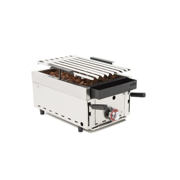 Churrasqueira A Gás De Pedra Vulcânica com Grelha De Aço Inoxidável Ajustável Em 3 Alturas – Válvulas: 1 – Queimadores: 2 – Potência: 6,6 kW – Superfície útil: 280×500 mm – Dimensões: 370x600x332 mm