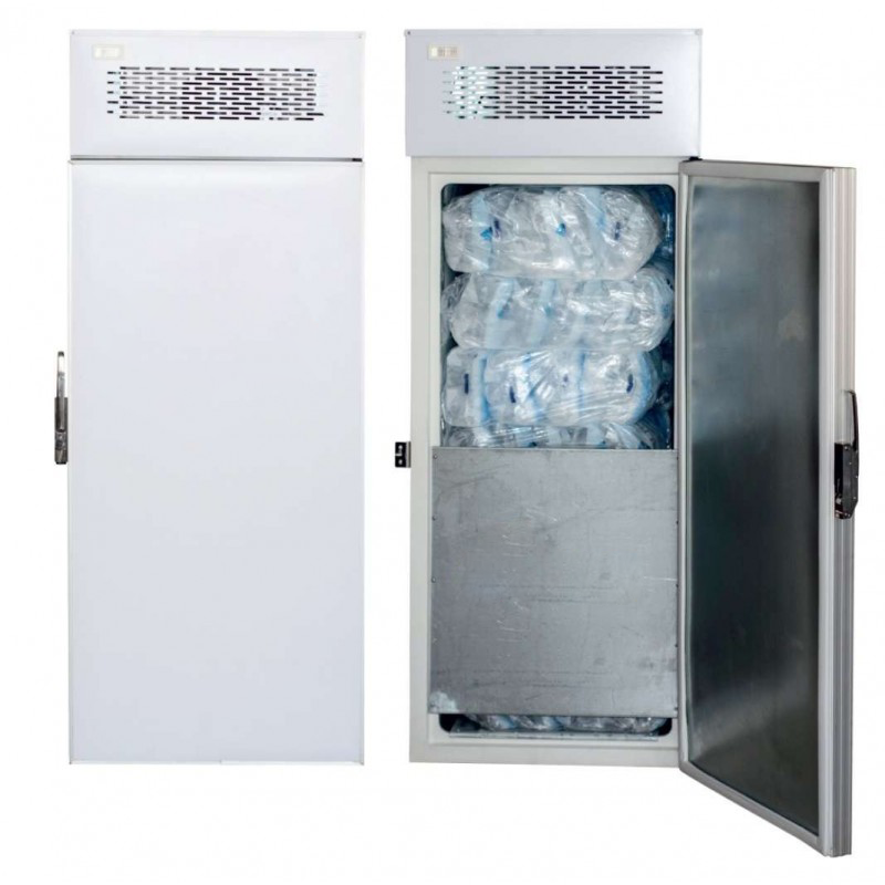 Características técnicas – Câmara de conservação de produtos congelados, especialmente concebida para o armazenamento de sacos de gelo. – Exterior em chapa revestida a plástico. – Interior em chapa galvanizada. – Isolamento em poliuretano injetado, isento de CFC. – Espessura do isolamento 60mm. – Porta com caixilho em alumínio. – O compressor está localizado na parte superior. – Termómetro exterior. – Puxador com chave. – Gás refrigerante R290. – Tensão: 220-240V.