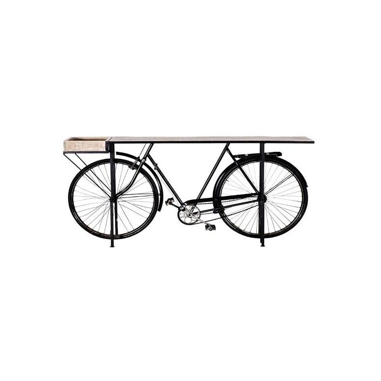 Consola Bike, uma verdadeira bicicleta vintage, com um tampo de prateleira em madeira maciça de acácia reciclada numa cor branqueada, uma peça de mobiliário única num estilo Étnico-Industrial, com uma personalidade indiscutível, que mobilia qualquer divisão como peça de entrada ou como mesa de consola na sala de estar ou no salão. – Dimensões: 180x40x90cm