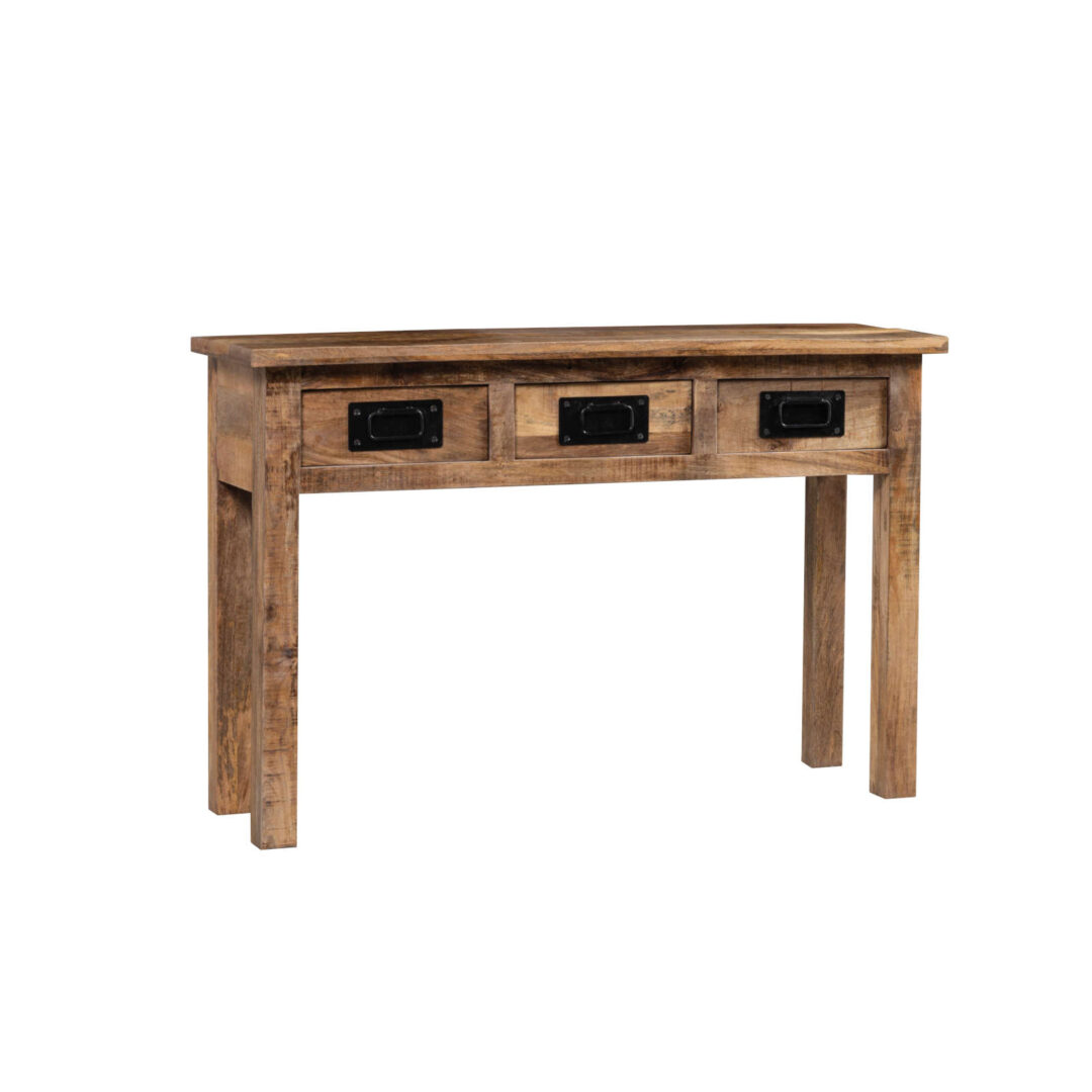 Espetacular consola Newport, inteiramente em madeira maciça. Composta por 3 gavetas com inserções em ferro preto. – Dimensões: 120x35x77cm