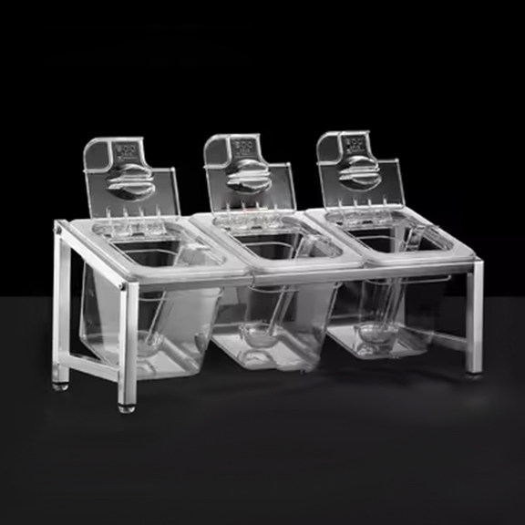 Estante inclinada para 3 recipientes plásticos transparentes 15cm altura com tampa e colheres – Recipientes GN 1/6 com tampa