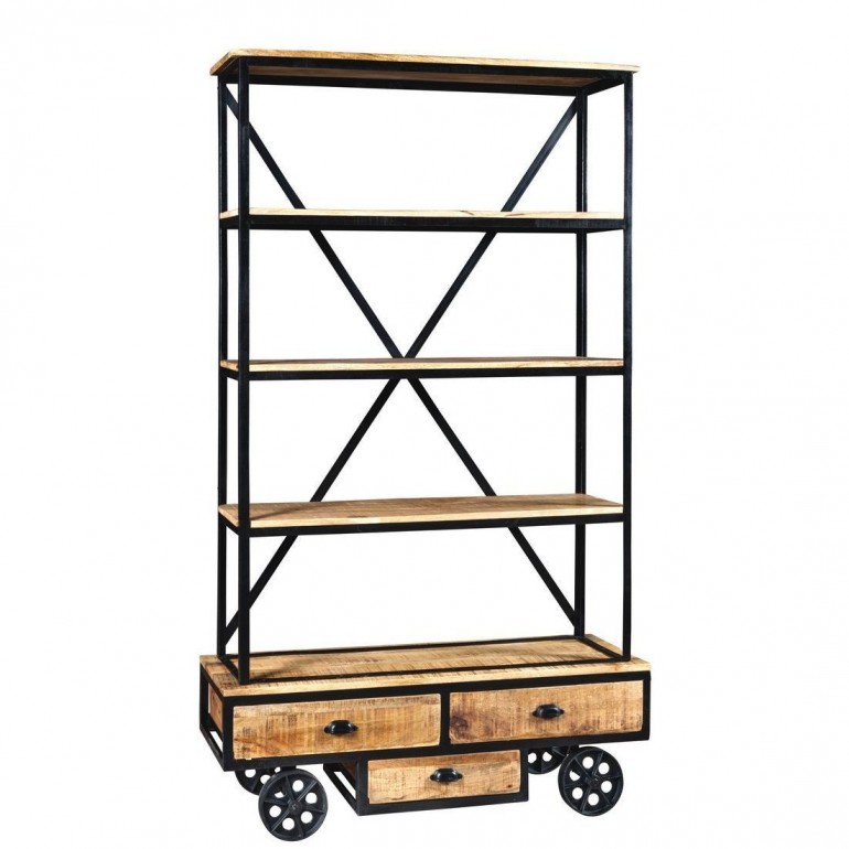 Estante de rodas industrial em madeira maciça de acácia com estrutura de ferro forjado e rodas. A estante inspira-se no estilo dos antigos móveis de escritório. Combina facilmente com todos os móveis da sua divisão, dando um toque de originalidade e singularidade a qualquer divisão. Composta por 3 gavetas na parte inferior e 4 prateleiras na parte superior da estante. – Dimensões: 125x36x213cm