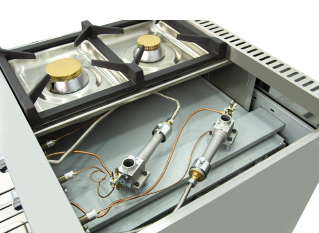 A placa de cozimento com cantos frontais arredondados em aço liso, com acabamento polido ou cromado maciço, tem espessura de 15 mm. Bacia removível em aço inox com capacidade de até 2 litros para facilitar as operações de limpeza e descarga de graxa. Nos modelos de 70 cm é possível diferenciar a cozedura graças aos queimadores a gás / resistências elétricas independentes. O acabamento cromado permite cozinhar sucessivamente diferentes alimentos sem o risco de transferência de cheiros e sabores, evitando assim a necessidade de limpar a chapa entre as diferentes cozeduras. Mais do que facilitar as operações de limpeza, o acabamento cromado se caracteriza pela menor dispersão de calor, tornando o ambiente de trabalho mais confortável. Bancada de 1 mm em aço inox AISI 18/10. Excelente alinhamento com as juntas.