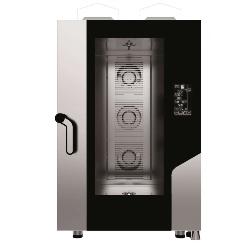 Caraterísticas técnicas – Fabricado em Itália por um fabricante de renome mundial. – Painel de controlo eletrónico Black Mask 7”. – Duas patentes: Airflowlogic™, Humilogic™. – Fácil de utilizar. – Temperatura de 30 a 260°C. – 10 fases de cozedura programáveis. – Vapor direto com regulação através do seletor Black Mask (10 etapas). – Pré-aquecimento. – Manutenção. – Arrefecimento rápido. – Câmara de cozedura AISI 304. – Vidro da porta inspecionável. – Proteção contra a água: IPX4. – Tomada USB. – Sistema HACCP. – Predisposição para sonda central (Opção a pedido). – Preparado para lavagem automática (Opção a pedido). – Recipiente de recolha de condensados, com escoamento na porta. – Dobradiça com fecho de porta para abertura regulável a 60°, 90°, 120°, 180°. – Arranque retardado programável até 24 h. – Possibilidade de programar o mantenedor. – Receitas programáveis: 100. – Pés reguláveis.
