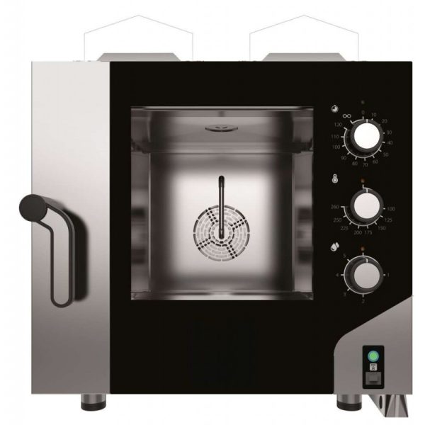 Forno de conveção a gás 5 bandejas GN1/1 – Alimentação eléctrica (V/F/Hz): 230V /1 F/ 50-60Hz – Potência: 9,3 kW – Temperatura: 100 – 260 (°C) – Refeições: 75 – 100 – Capacidade do tabuleiro: 5 pcs. GN1/1