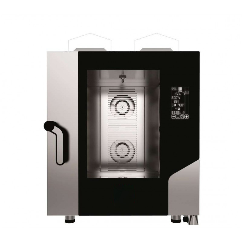 Caraterísticas técnicas – Fabricado em Itália por um fabricante de renome mundial. – Painel de controlo eletrónico Black Mask 7”. – Duas patentes: Airflowlogic™, Humilogic™. – Fácil de utilizar. – Temperatura de 30 a 260°C. – 10 fases de cozedura programáveis. – Vapor direto com regulação através do seletor Black Mask (10 etapas). – Pré-aquecimento. – Manutenção. – Arrefecimento rápido. – Câmara de cozedura AISI 304. – Vidro da porta inspecionável. – Proteção contra a água: IPX4. – Tomada USB. – Sistema HACCP. – Predisposição para sonda central (Opção a pedido). – Preparado para lavagem automática (Opção a pedido). – Recipiente de recolha de condensados, com escoamento na porta. – Dobradiça com fecho de porta para abertura regulável a 60°, 90°, 120°, 180°. – Arranque retardado programável até 24 h. – Possibilidade de programar o mantenedor. – Receitas programáveis: 100. – Pés reguláveis.