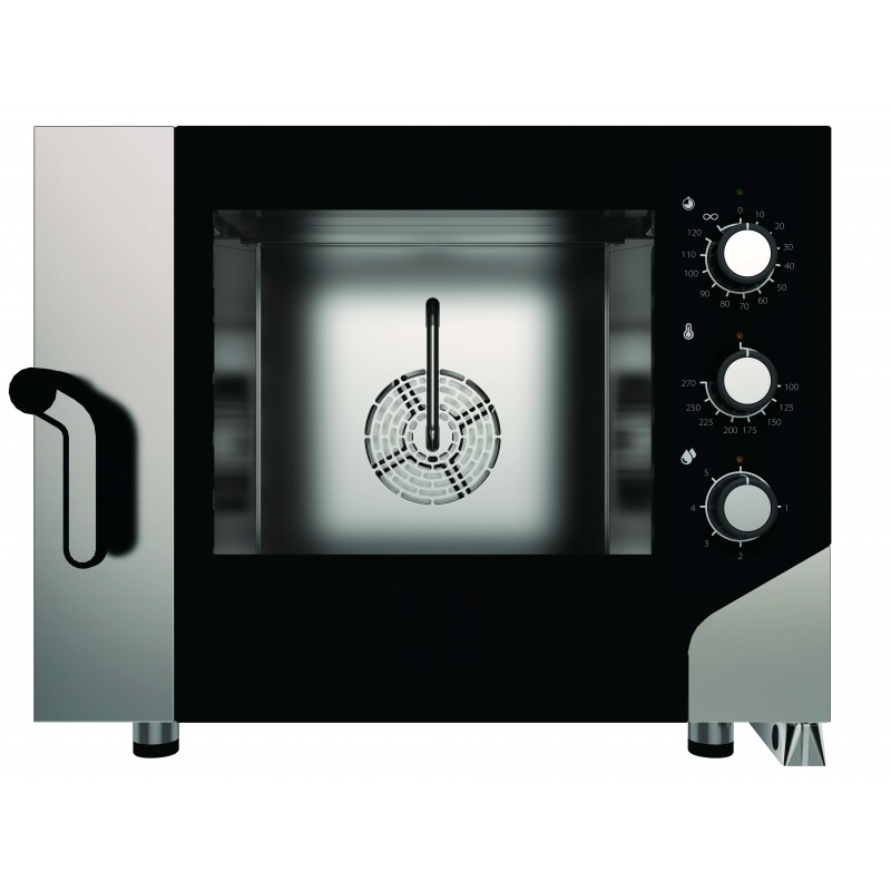 Forno Elétrico de Convecção Pastelaria/Padaria 4 Bandejas 600X400mm – Alimentação eléctrica (V/F/Hz): 380-400V / 3 F / 50-60Hz – Potência: 7,8 kW – Temperatura: 100 – 275 (°C) – Refeições: 72 – 120 – Capacidade do tabuleiro: 4 pcs. 600×400 – Peso: 92,4 – Dimensões: 850x1044x700 (LxPxA) mm