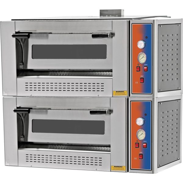 Forno para Pizza a Gás Capacidade 9 + 9 Pizzas Diâmetro 30cm 1400x1250x990mm – Câmaras: 2 – Número de pizzas: 9+9 – Diâmetro da pizza (mm): 300 – Potência (kw): 48,0 – Peso (kg): 345 – Dimensões internas (LxPxA) mm: 2x (915x915x150) – Dimensões (LxAxP) mm: 1400x1250x990