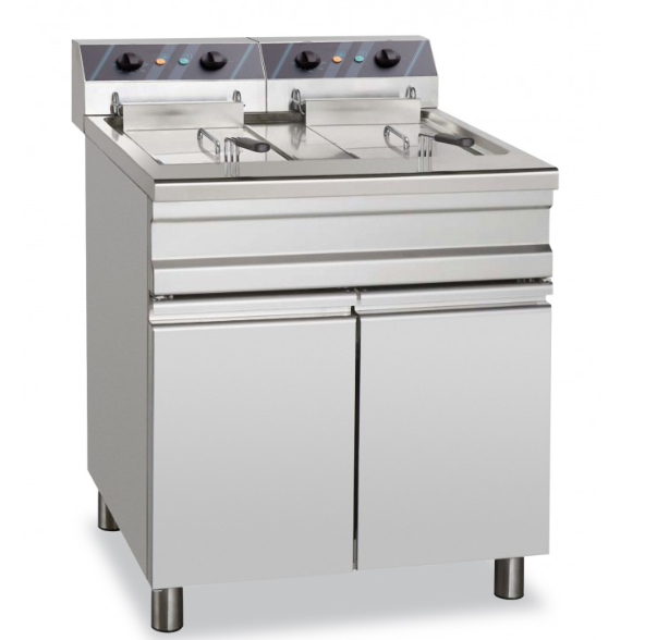 A gama de fritadeiras Stand Alone pode ser elétrica e a gás. A parte superior é de aço inoxidável. A máquina está equipada com cestos de aço cromado com cabo atérmico. Os tanques possuem uma grande área fria para depósito de resíduos. Termostato de regulação de temperatura e termostato de segurança. Os modelos a gás são equipados com queimadores de alta eficiência com chama piloto e dispositivo piezoelétrico.