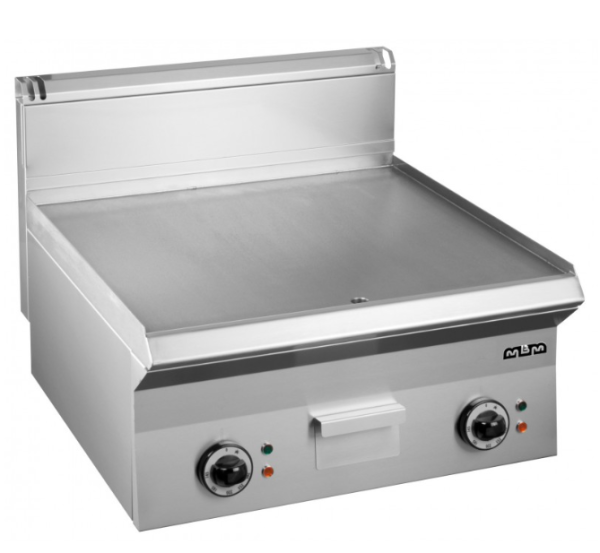A placa de cozimento com cantos frontais arredondados em aço liso, com acabamento polido ou cromado maciço, tem espessura de 15 mm. Bacia removível em aço inox com capacidade de até 2 litros para facilitar as operações de limpeza e descarga de graxa. Nos modelos de 70 cm é possível diferenciar a cozedura graças aos queimadores a gás / resistências elétricas independentes. O acabamento cromado permite cozinhar sucessivamente diferentes alimentos sem o risco de transferência de cheiros e sabores, evitando assim a necessidade de limpar a chapa entre as diferentes cozeduras. Mais do que facilitar as operações de limpeza, o acabamento cromado se caracteriza pela menor dispersão de calor, tornando o ambiente de trabalho mais confortável. Bancada de 1 mm em aço inox AISI 18/10. Excelente alinhamento com as juntas.
