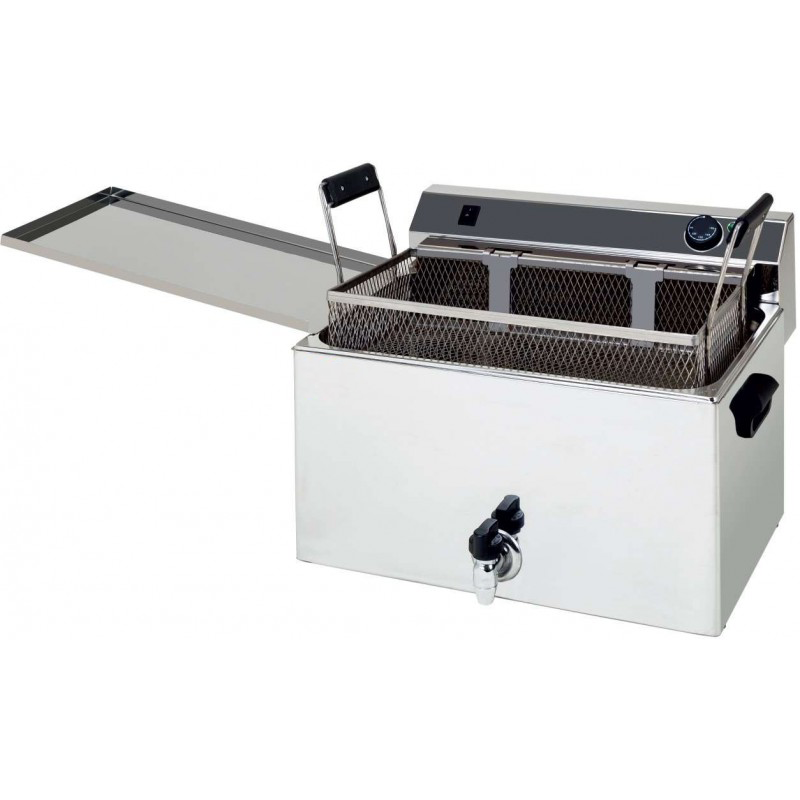 Características técnicas – Fritadeiras especiais para padaria com um design simples e eficiente. – Equipamento trifásico de alta potência com contactor. – Construída em aço inoxidável. – Aquecedor blindado em aço inoxidável. – Cabeça amovível para facilitar a limpeza da cuba. – Termóstato de trabalho regulável 190°C. – Termostato de segurança 240°C. – Equipado com torneira de drenagem de óleo. – Terminais de fixação em aço inoxidável. – Interruptor de ligar/desligar para controlar a alimentação eléctrica principal e luz indicadora de estado “ON”.