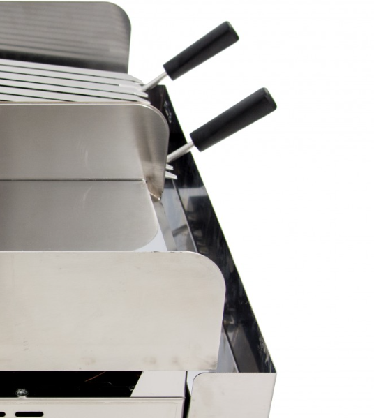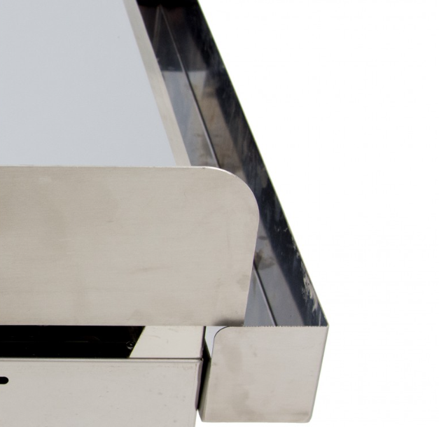Grelha com 15 mm de espessura. Altura do peitoral de 100 mm e tampo soldado de 3 mm de espessura evitando assim o acúmulo e filtragem de gordura entre o peitoral e os peitorais. Fabricado em aço retificado com tratamento anti-oxidação.