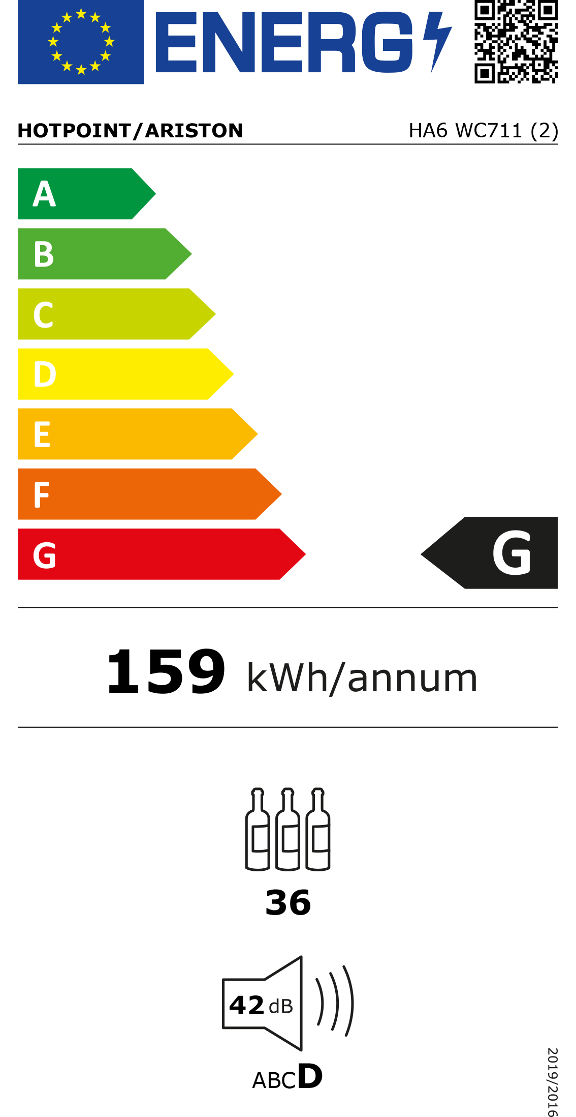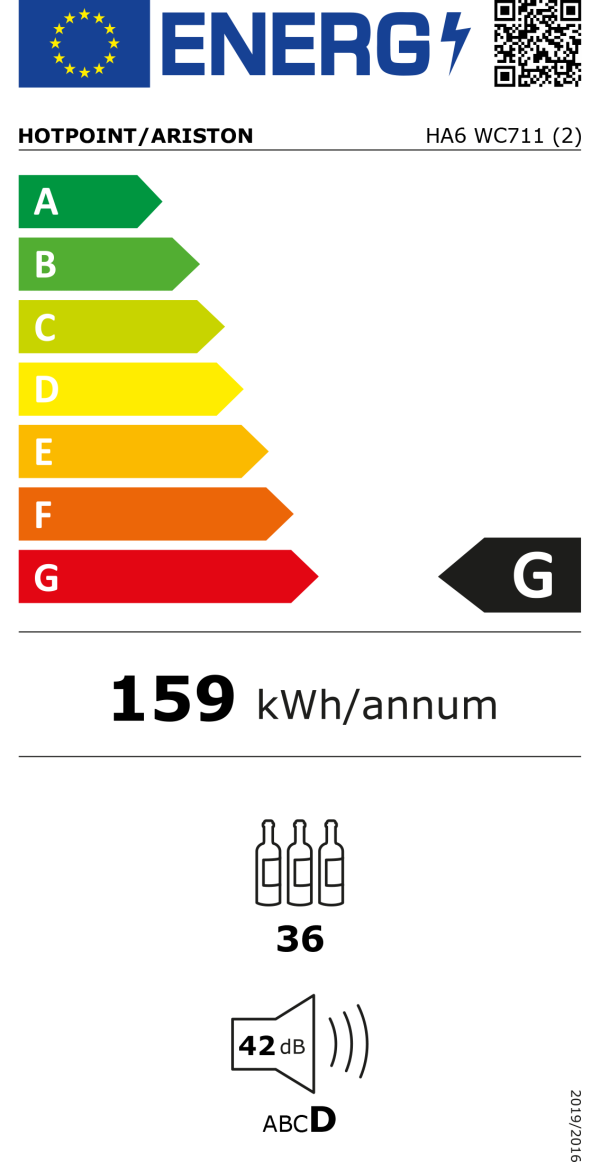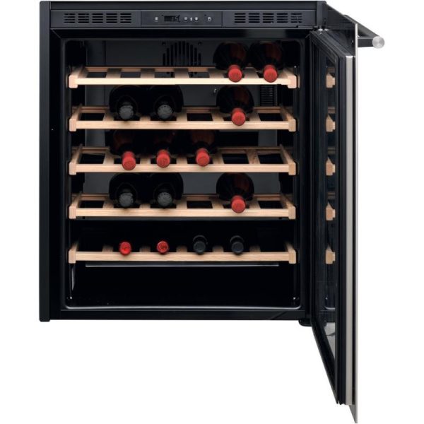 Capacidade de armazenamento: 36 garrafas Sistema antivibração Sistema de anticondensação Iluminação LED Consumo médio anual de energia em kilowatt-hora por ano (kWh/a): 159 Capacidade líquida total: 83lts Temperatura entre 6ºC – 18ºC Tipo de controlo: Eletrónico Termostato frigorífico: Digital Classe de eficiência energética: G Dimensões (AxLxP): 680x560x555 mm
