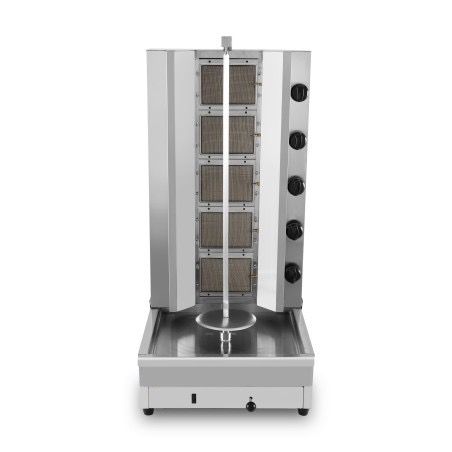 Características técnicas – A nossa série económica de grelhadores para kebab a gás, concebida para oferecer soluções fiáveis ao melhor preço. – Grelhador profissional para Doner / Gyros / Kebab / Shawarma Equipado com 5 queimadores a gás de alto desempenho com grelha de proteção em aço inoxidável. – Temperatura regulável individualmente para cada queimador. – Pedras do queimador em cerâmica de alta resistência. – Espada regulável para introduzir a peça de carne a cortar. – Fabricado com estrutura, espigão e placa de carne em aço inoxidável. Estrutura, espada e placa de carne em aço inoxidável. – Equipada com um tabuleiro de recolha de gotas em aço inoxidável. – Motor protegido, fiável e de grande durabilidade situado na parte inferior com rotação nos dois sentidos. – Preparado de série para GPL (propano / butano). Os injectores são fornecidos separadamente para a passagem ao gás natural, que deve ser sempre efectuada por um profissional. – RÁPIDO E FÁCIL DE LIMPAR: Todas as peças que entram em contacto com os alimentos podem ser retiradas e limpas com um pano húmido, água morna e um pouco de detergente. As peças separadas também podem ser lavadas na máquina de lavar loiça.