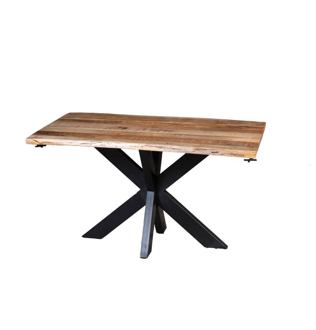 Mesa extensível Pike, em madeira maciça, inteiramente feita à mão. Acabamento natural que realça o grão quente da madeira. Pernas em X em ferro preto. Mesa extensível com 2 tábuas extensíveis de 40 cm. Este tipo de mesa é ideal tanto para a sala de jantar como para um escritório ou escritório, graças à sua solidez e versatilidade. A combinação do calor da madeira com o aspeto industrial do metal torna-a uma peça distinta, capaz de se adaptar a diferentes contextos de vida. – Dimensões: 90×180/260x78cm