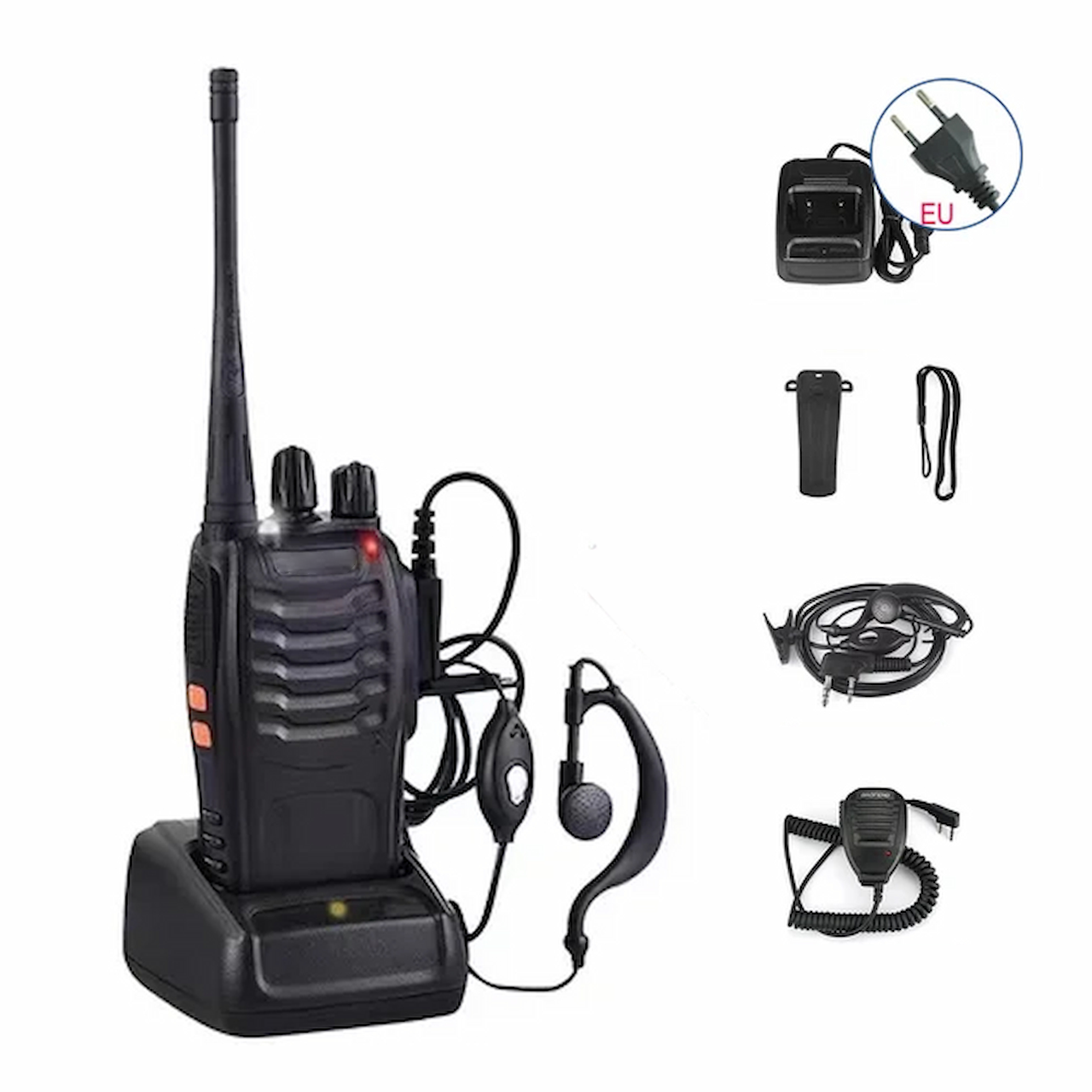 Pack de 4 Walkie Talkies portáteis com carregador UE, auricular e microfone – Capacidade da Bateria: 1500mAh – Canais de Armazenamento: 16 – Alcance máximo: 3km-5km – Taxa de Frequência: 400-470MHz – Dimensões: 100x23x48mm