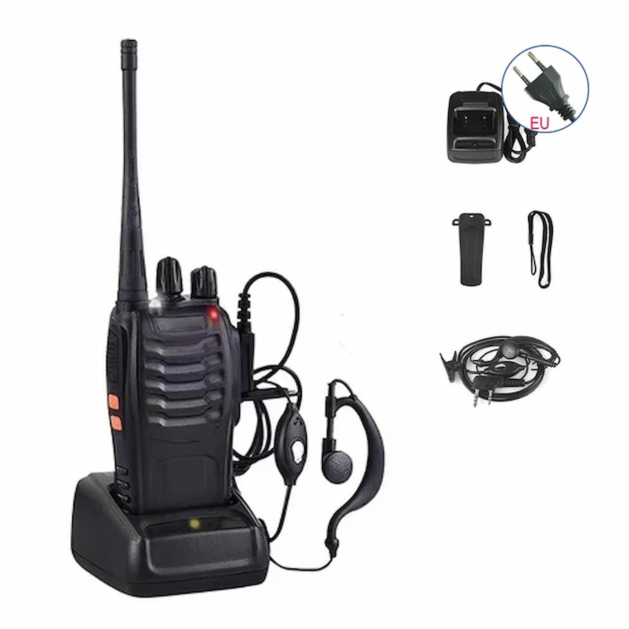 Pack de 4 Walkie Talkies portáteis com carregador UE e auricular – Capacidade da Bateria: 1500mAh – Canais de Armazenamento: 16 – Alcance máximo: 3km-5km – Taxa de Frequência: 400-470MHz – Dimensões: 100x23x48mm