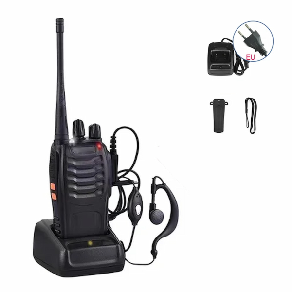 Pack de 4 Walkie Talkies portáteis com carregador UE – Capacidade da Bateria: 1500mAh – Canais de Armazenamento: 16 – Alcance máximo: 3km-5km – Taxa de Frequência: 400-470MHz – Dimensões: 100x23x48mm